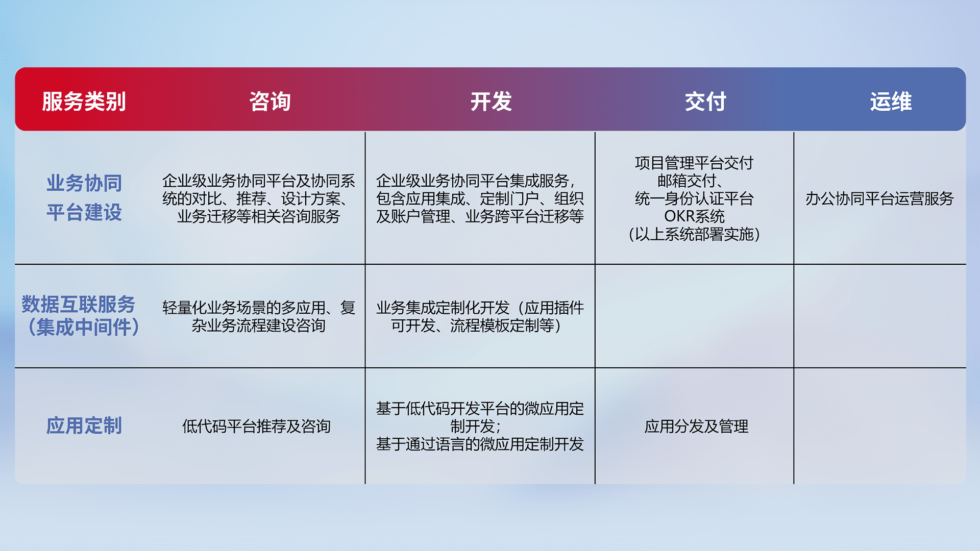 针对钉钉、、、企微、、IDaas等平台级产品提供产品的规划、、方案、、、、交付、、、、定制化开发等服务,,,实现如统一协同办公、、、、智能客户服务、、、、混合会议管理、、、智能数据查询、、、、等业务场景,,,实现数字化转型。。。